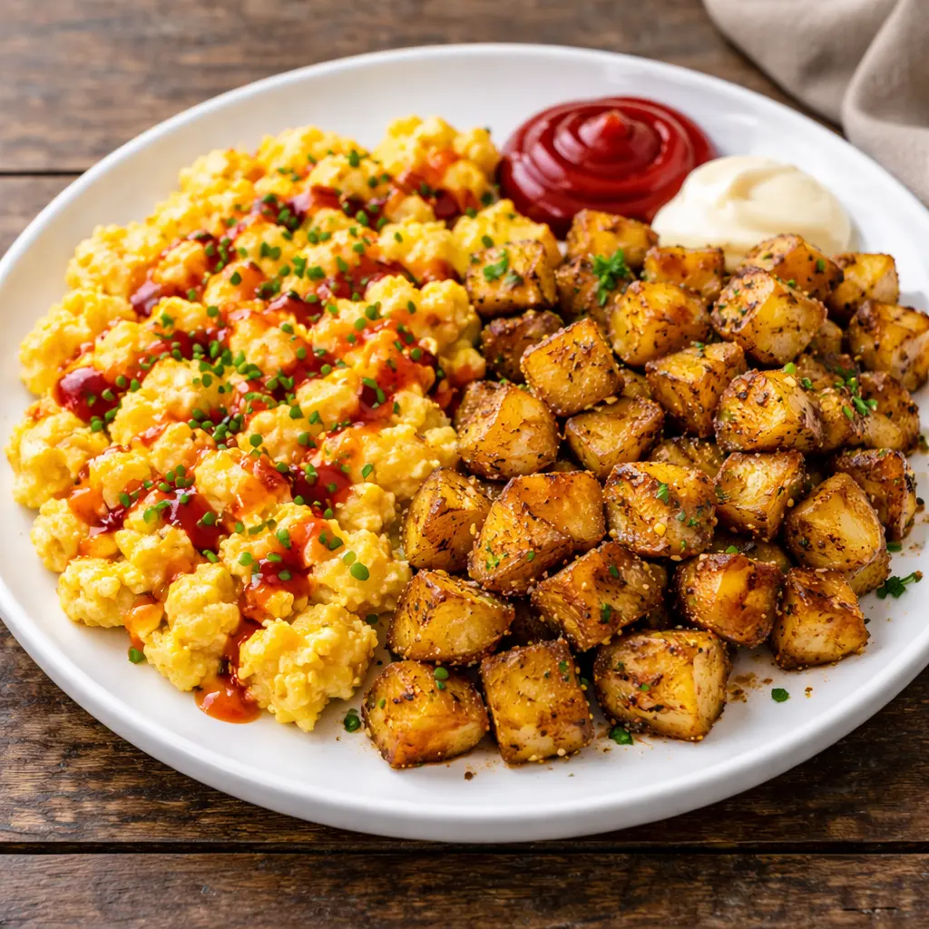 Simple skillet eggs with crispy breakfast potatoes—an easy and satisfying morning meal. *Recipe image is AI generated.